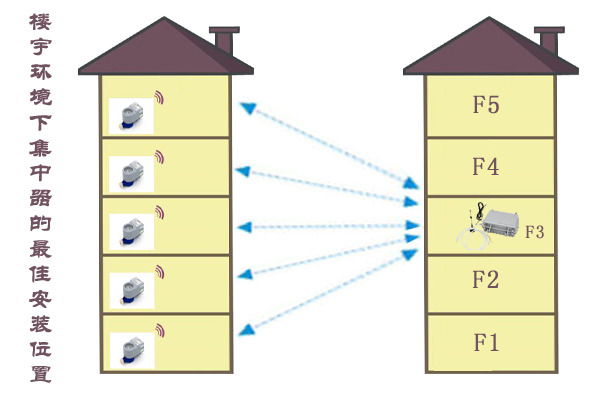 1、集中器安裝的位置要盡量避免與表具之間相對位置處于垂直方向,比如說,A棟樓共5層,裝有X只表,如果為了與A棟表通信,而在A棟樓頂裝集中器,通信效果遠(yuǎn)不如安裝在對面樓3層位置。如下圖。