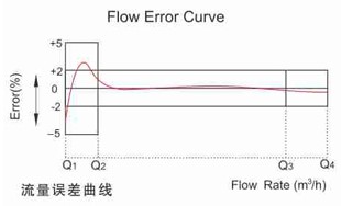 b、從包括分界流量(Q2)在內(nèi)到包括過(guò)載流量(Q4)的高區(qū)中的最大允許誤差是±2%(熱水表為±3%)